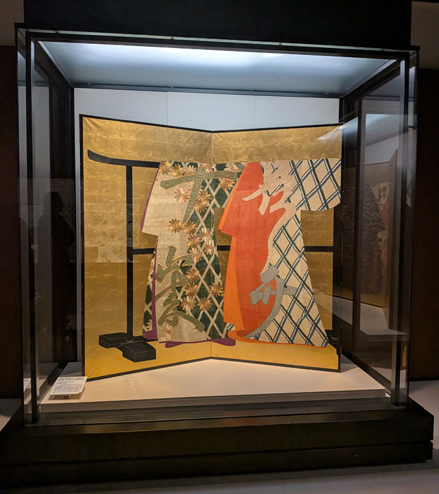 「時代小袖雛形屛風」は全部で100点のそのままでは保存が難しい着物を屏風に仕立てたもの。布地が立体的に表現されています。