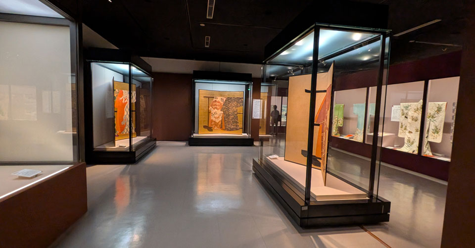 展示室を2部屋使った展覧会は、重文3点を含む総展示数140点、うち着物資料は約30点にのぼります。
